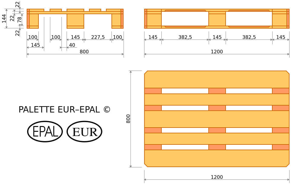 Eine Europalette ist eine Mehrwegpalette aus dem Tauschsystem des Europools. Sie ist genormt, ihre Grundfläche beträgt 0,96 Quadratmeter und ihre Maße sind 120 × 80 × 14,4cm (Länge × Breite × Höhe). Je nach Holzfeuchte liegt das Eigengewicht einer Europalette zwischen 20 und 24kg. Jede Europalette ist UIC-genormt und entspricht den Bestimmungen der EPAL ( European Pallet Association e.V.).